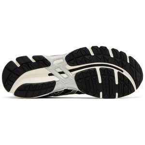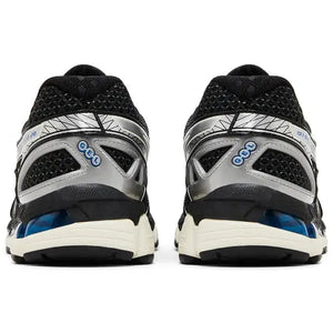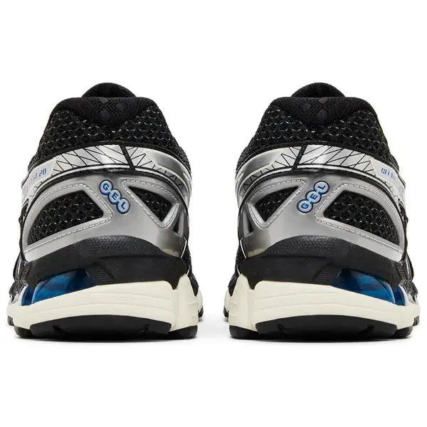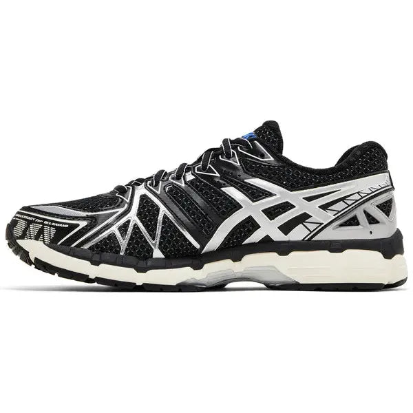 The ASICS Gel Kayano 20 'Black Pure Silver' combines ventilated black mesh with a supportive FLUIDFIT cage in metallic silver. Vibrant blue accents distinguish the various branding elements, as well as the visible Gel inserts that augment the cream-colored EVA midsole. Underfoot, the rubber outsole is equipped with ASICS' TRUSSTIC support system for midfoot stability.
