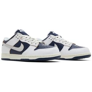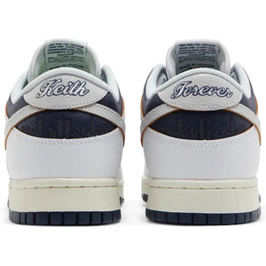 The HUF x Nike Dunk Low SB ‘New York’ celebrates the 20th anniversary of the streetwear brand founded by Keith Hufnagel. This pair honors the late professional skateboarder’s New York roots, highlighted by a tumbled leather upper that combines a navy base, white overlays, and an off-white Swoosh. The HUF logo — along with a jeweled mini-Swoosh — adorns the toe box, while thin nylon tongues display woven tags featuring Nike SB and New York City branding. ‘Keith Forever’ is embroidered across the heel tabs, which sit just above navy panels marked with an embossed graphic depicting a retro NYC skyline. Inside the shoe, mismatched sockliners in HUF’s signature lime green hue showcase mismatched HUF and Nike SB branding. Finally, excising the leather quarter panel with a sharp blade reveals a hidden tie-dye print on canvas, nodding to HUF’s Dunk High collaboration from 2004.