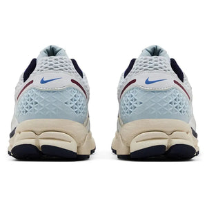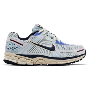 This iteration of the Nike Zoom Vomero 5 is made with a white mesh upper, allowing for flexibility and breathability. White overlays with red accents round out the toe box, while blue overlays also run under the laces and white forms a strap around the heel. The middle of the shoe is supported by a white TPU cage for stability. The Nike swoosh appears in black on top of this TPU cage on each side. The heel strap also has a small Nike swoosh, and the heel counter is a pale blue tinted TPU cage in a crisscross pattern. Nike Vomero 5 branding appears in red on the tongue, and a black and off-white outsole completes the look.