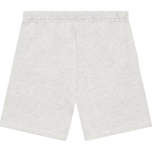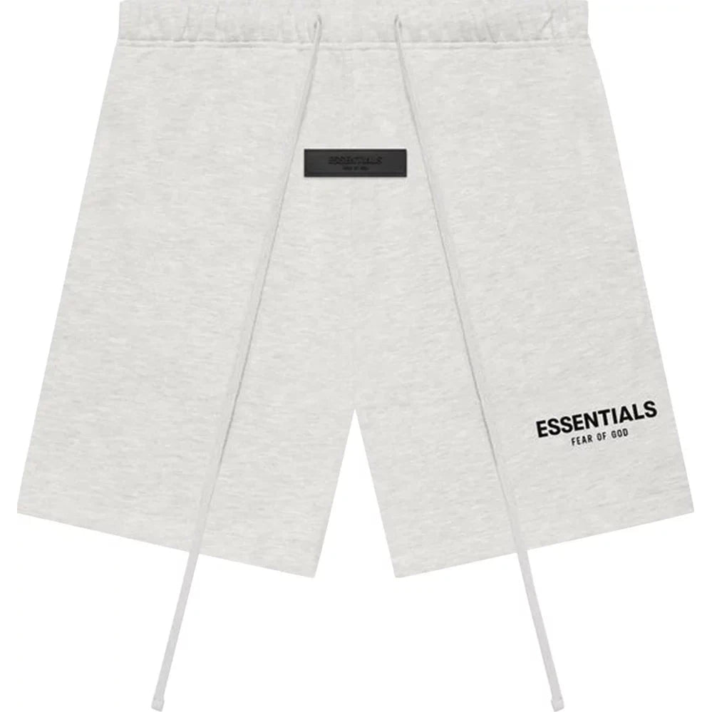 The FOG Essentials Light Oatmeal Sweat Shorts feature a relaxed fit, rubber and reflective "ESSENTIALS" branding on the front, and an elastic waistband with long drawstrings.