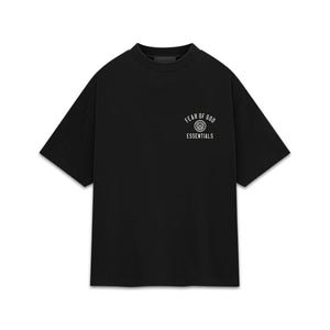 The Essentials Tee is made from core 100% cotton jersey. The rib-knit crewneck tee fits relaxed in the body with dropped shoulders. A collegiate inspired "Fear of God Essentials" logo with University crest is printed on the chest. An Essentials Fear of God rubberized label is at the back collar.